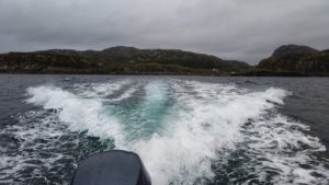 Dostali jsme záchranné vesty a společně s dalšími deseti pasažéry se nalodili na rychločlun. Všichni měli skvělé vybavení teleobjektivy, dalekohledy a hlavně velmi dobré oblečení (my jsme byli aspoň dobře oblečení). Po cestě na lodi se počasí neuvěřitelně zhoršilo – začalo výrazně pršet a spršku jsme dostávali i ze stran, kdy se o loď tříštila mořská voda. Tisknouc se na sebe jsme byli rádi za trochu tepla a toužebně jsme vyhlíželi přistávací pláž. Vítr nám šlehal do tváří a v okamžiku, kdy si člověk řekl, že jsme na ostrov opravdu zajíždět neměli, jsme zamířili do zátoky, kde se počasí náhle zlepšilo.